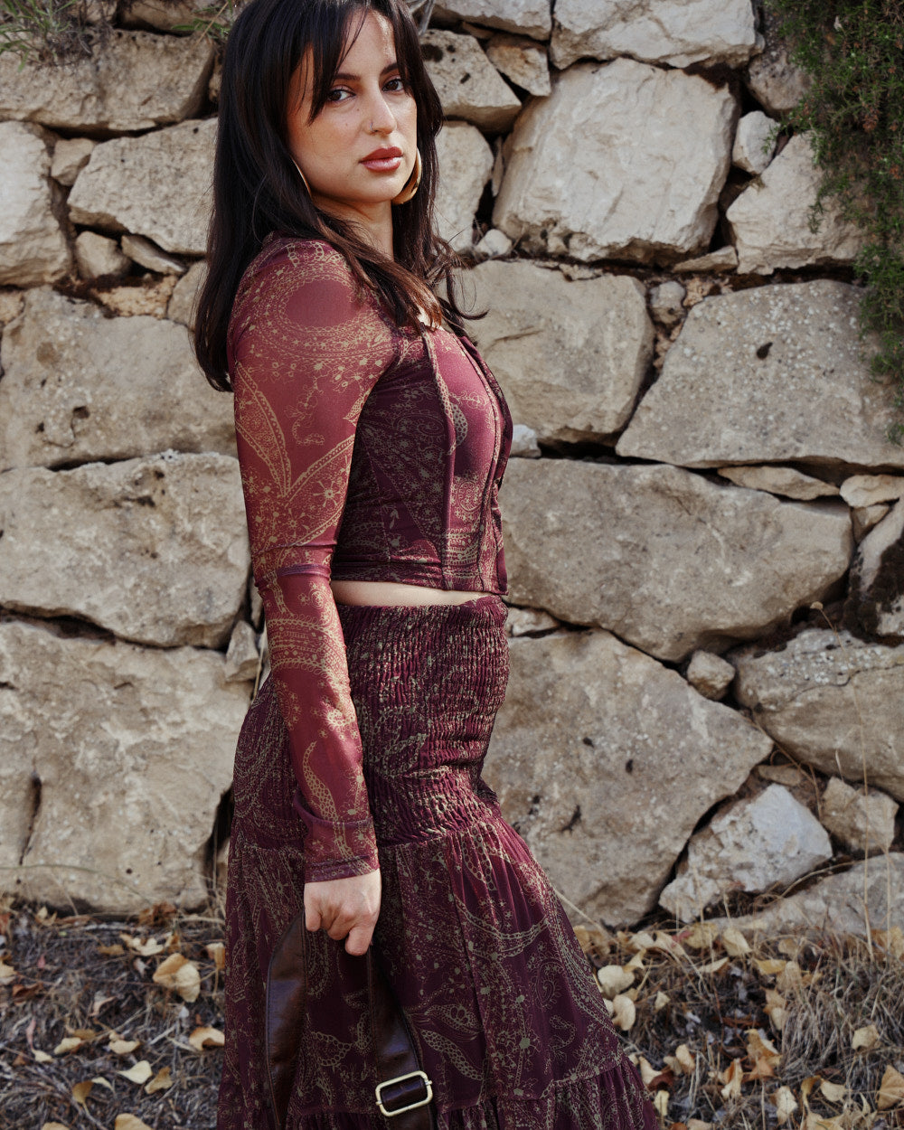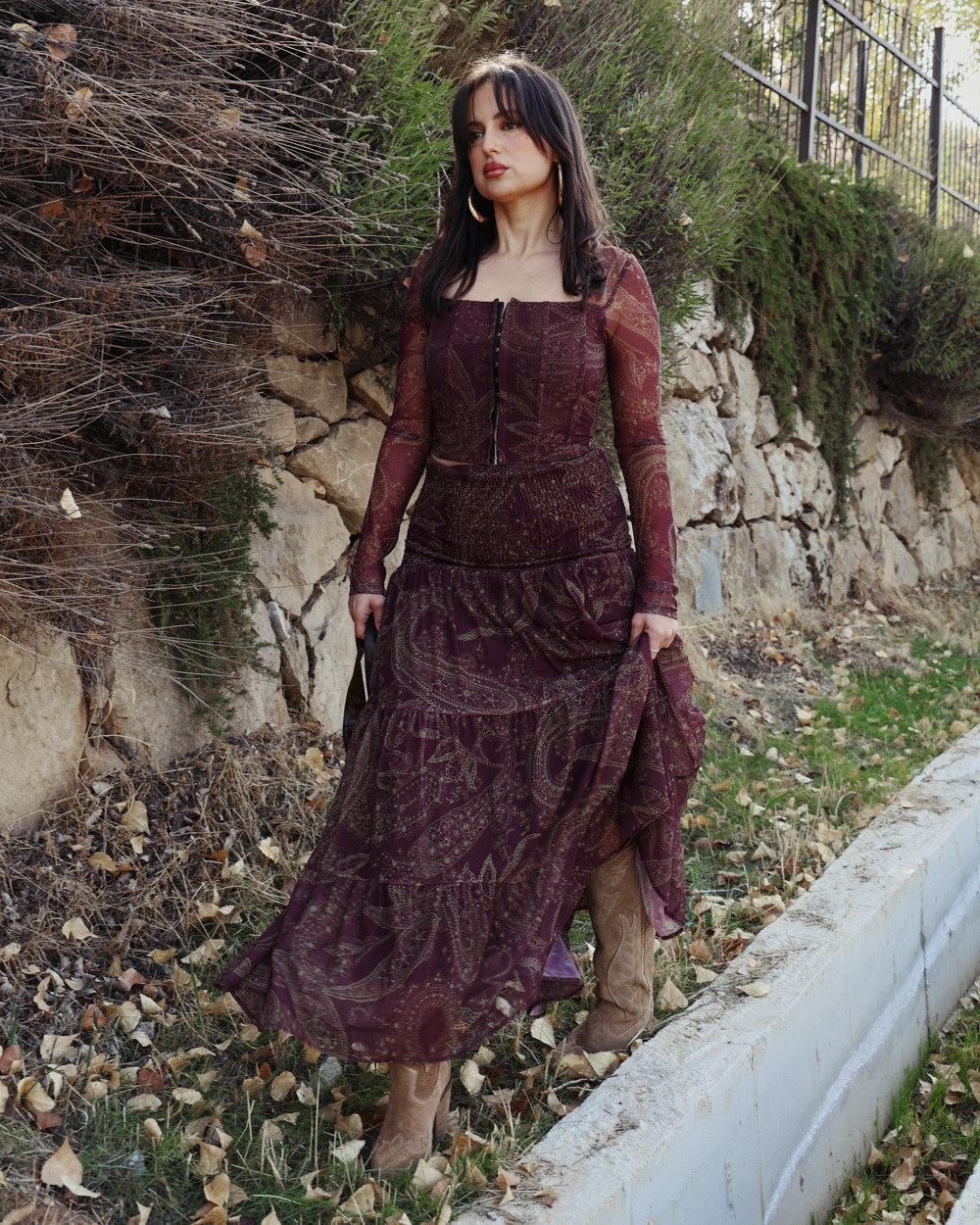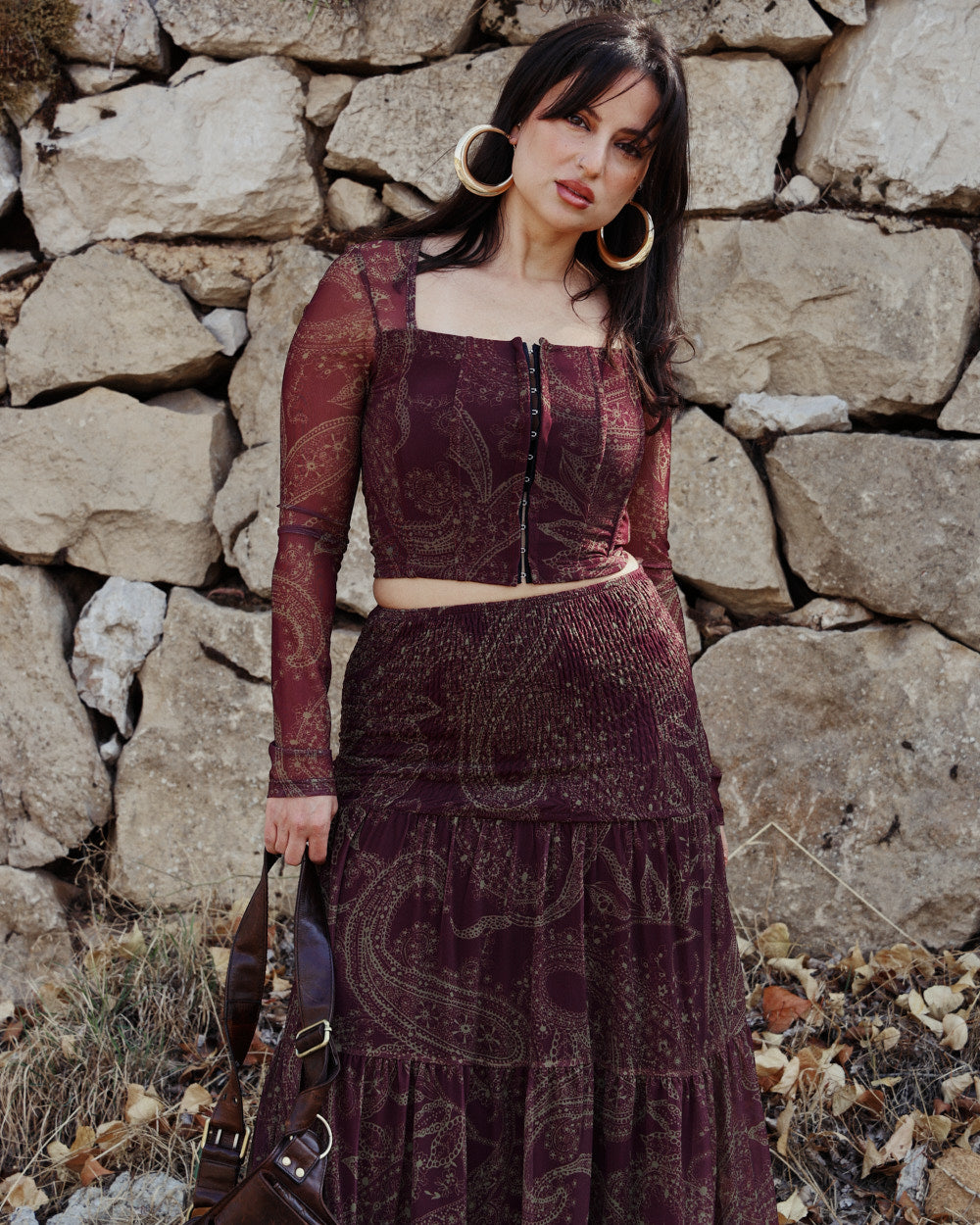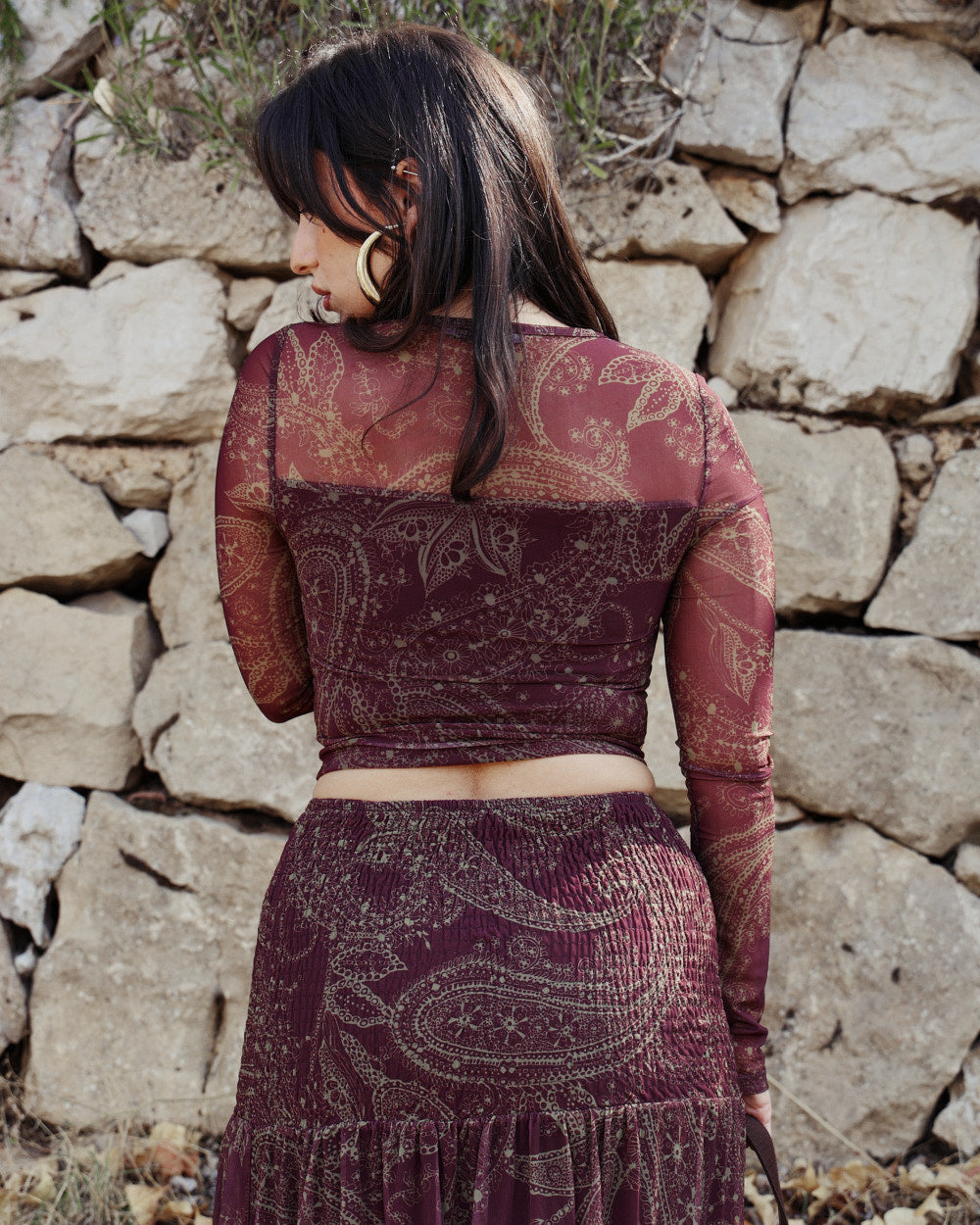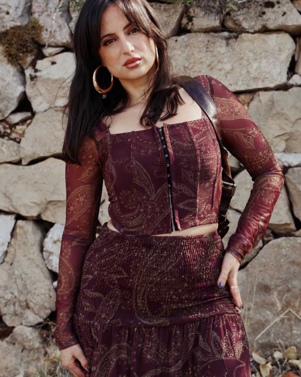 The Alma Top is a romantic mesh corset-style top designed to shape the waist while keeping a soft, bohemian feel. Crafted in a deep plum paisley print, it features a structured hook-and-eye front that mimics a corset closure, paired with sheer sleeves for an effortless, feminine finish. The fitted silhouette highlights your curves with comfort and ease.