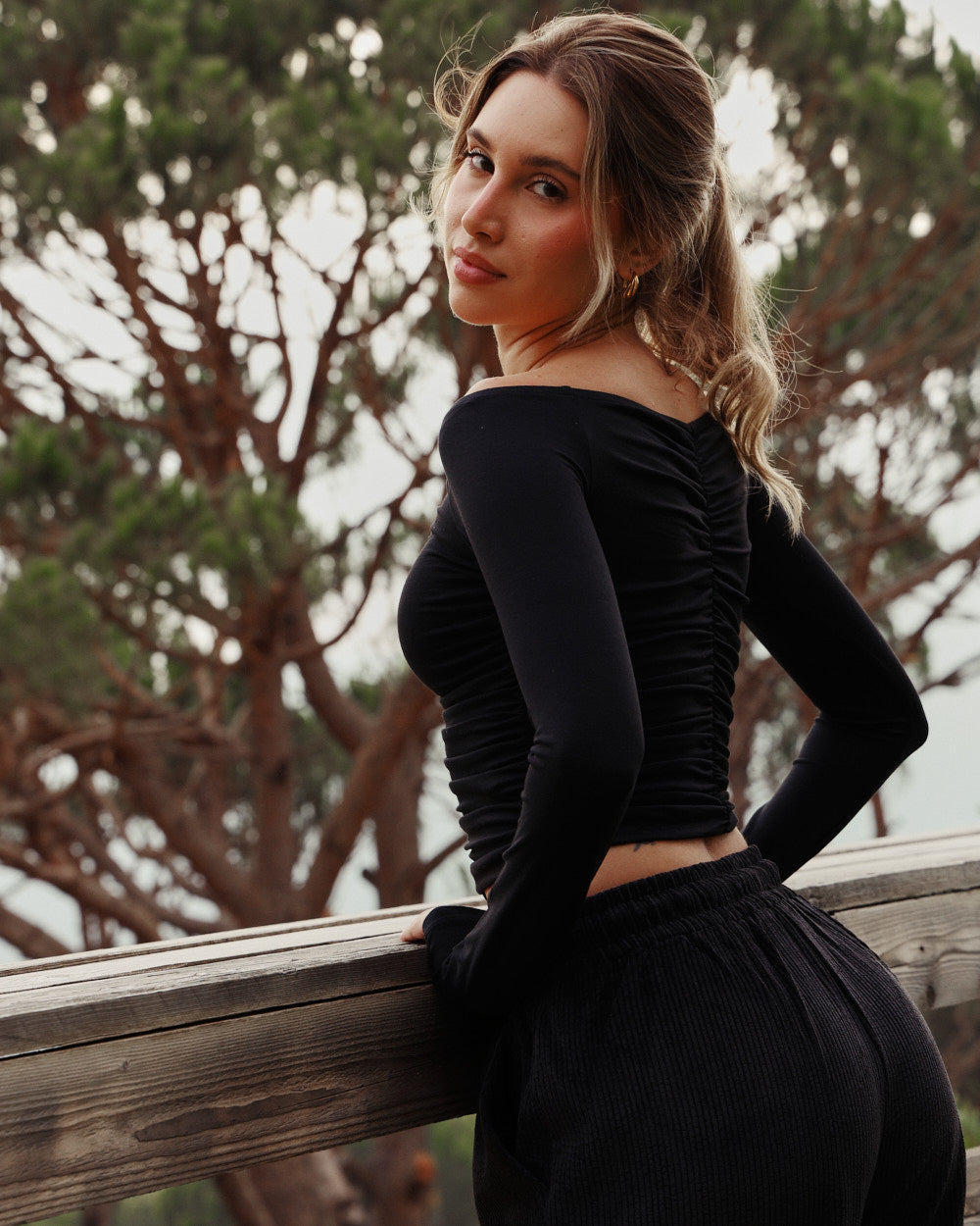 The Just A Little Off Top is that perfectly undone piece that says effortless but knows exactly what it’s doing. With its off-shoulder neckline and ruched silhouette, it hugs your curves while leaving just the right amount to the imagination. Made from buttery soft stretch fabric, it’s the kind of top that feels as good as it looks : flirty, sleek, and impossible to ignore.