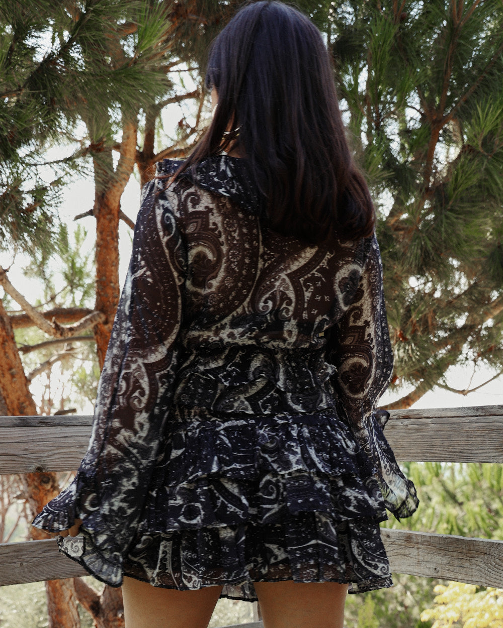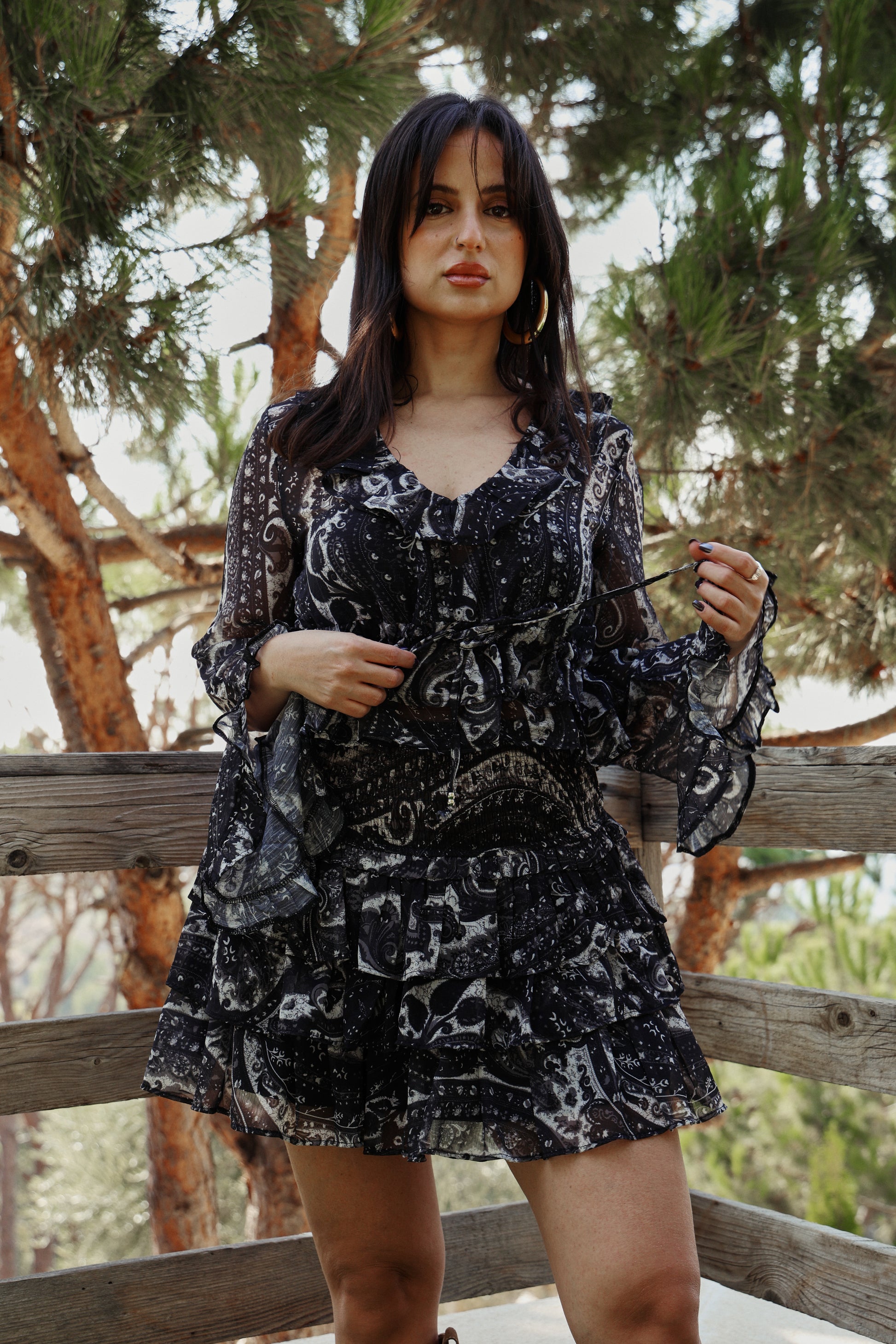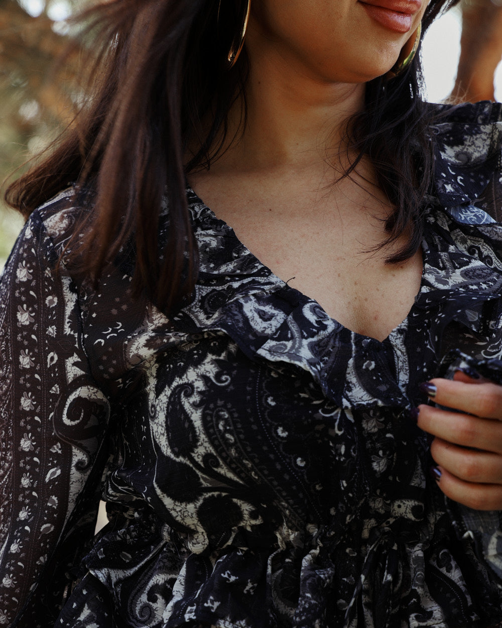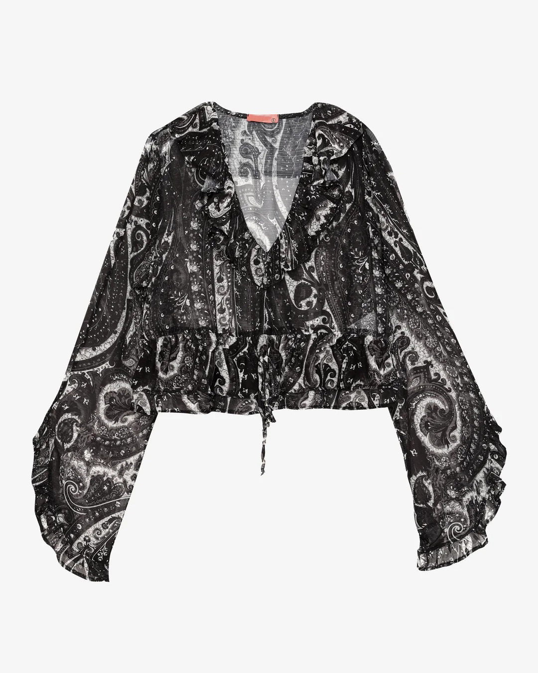A sheer, flowy moment made to steal the scene. This paisley print crop comes with soft ruffles, a deep V neckline and dramatic bell sleeves that move with every step. Lightweight, effortless and made for your moody goddess days.