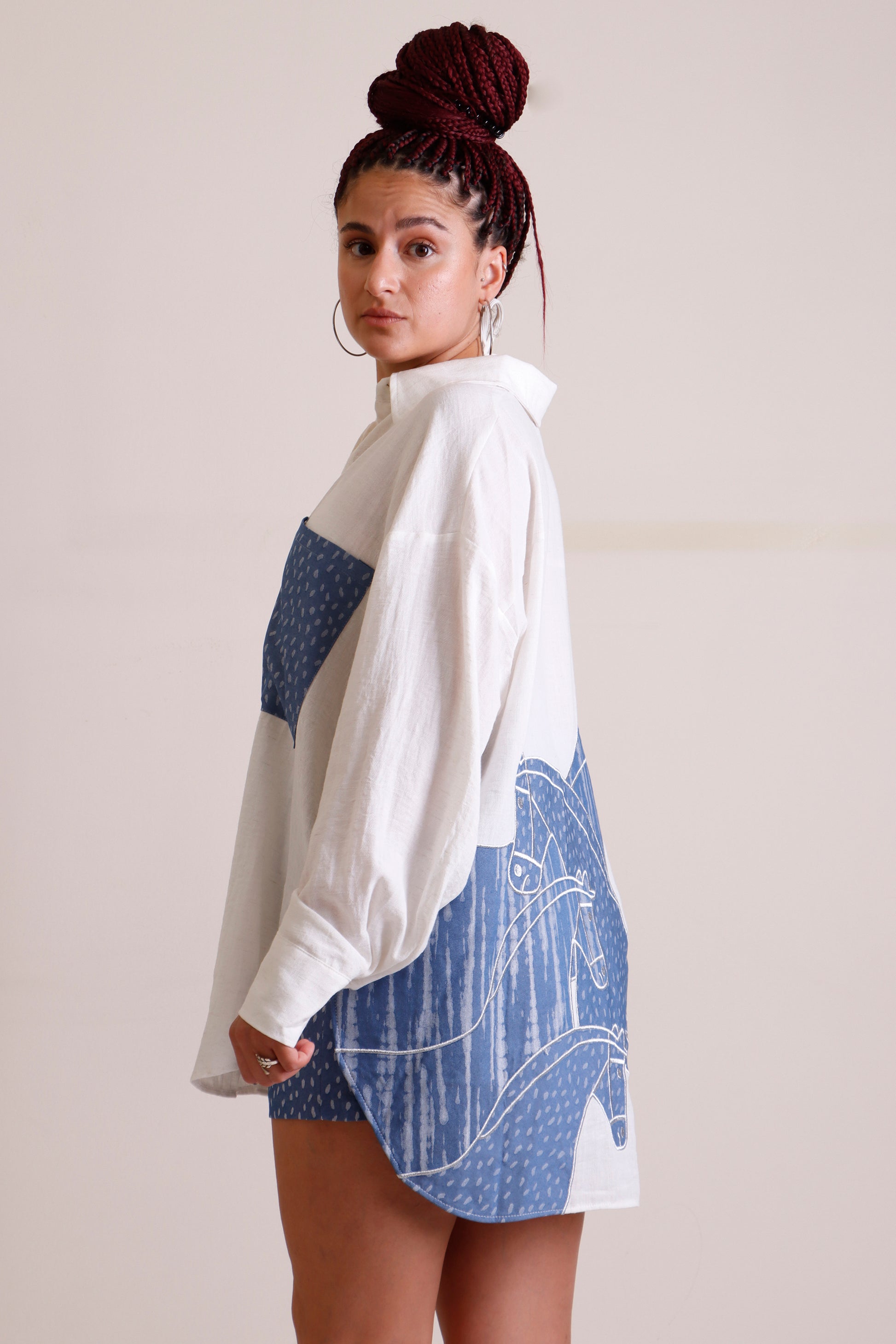 The Santorini Shirt offers a loose and relaxed fit, perfect for all-day comfort. It features a blue and white pattern pocket on the front. The highlight of this shirt is the embroidered gathering of horses on the back, in blue and white. Made with high-quality material, this piece of art pairs perfectly with the matching Santorini Shorts. Upgrade your wardrobe with this timeless classic.