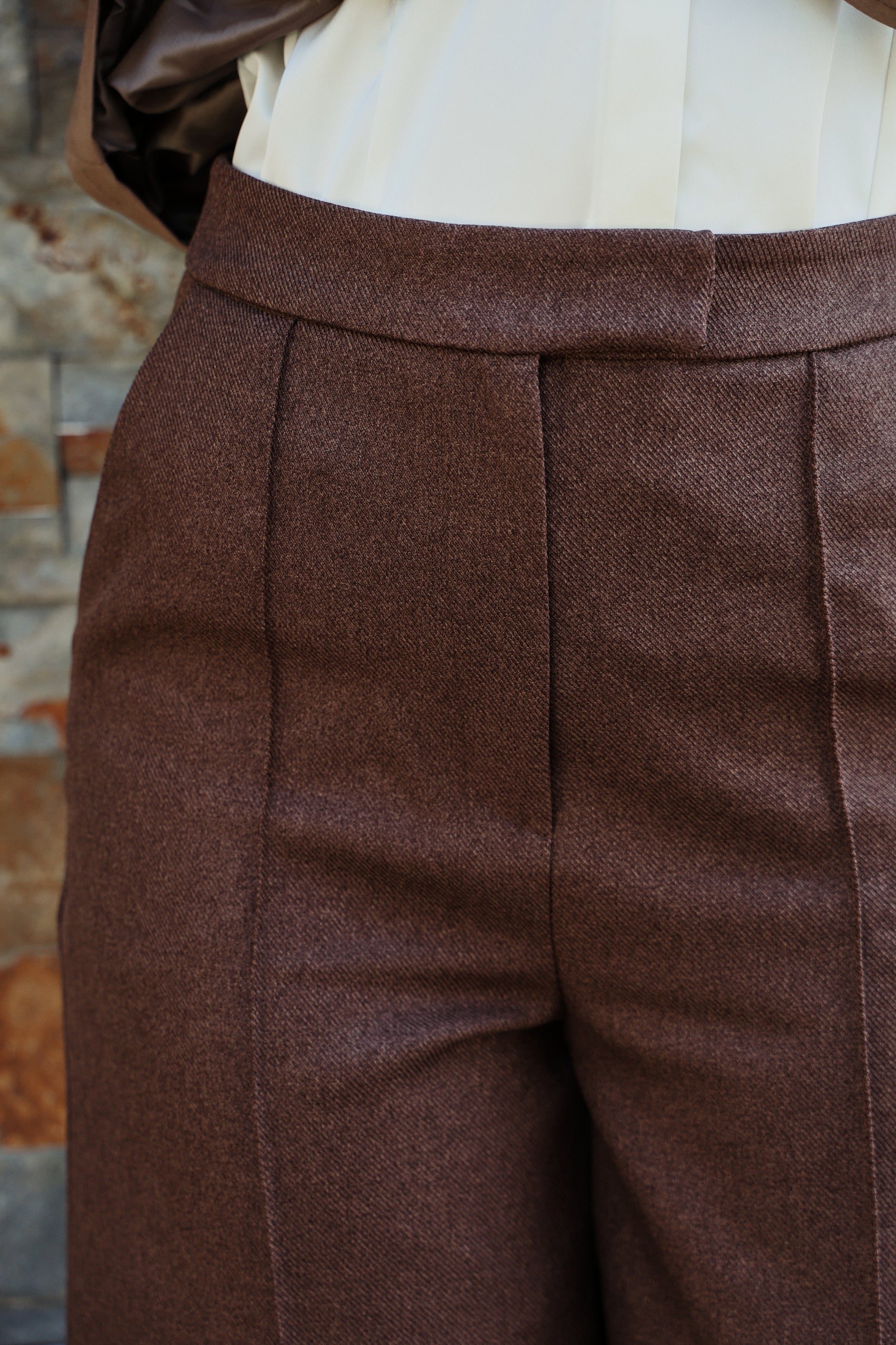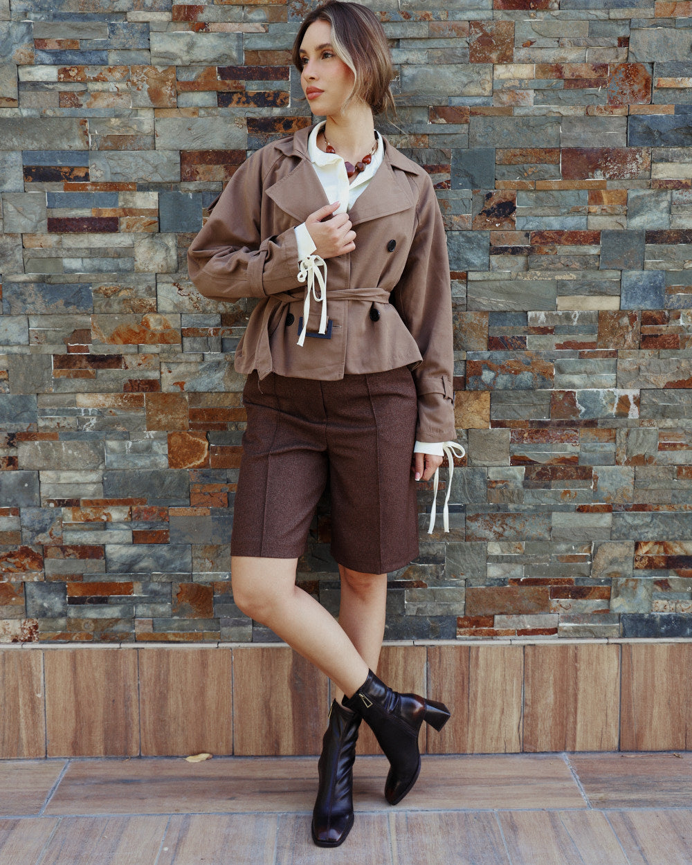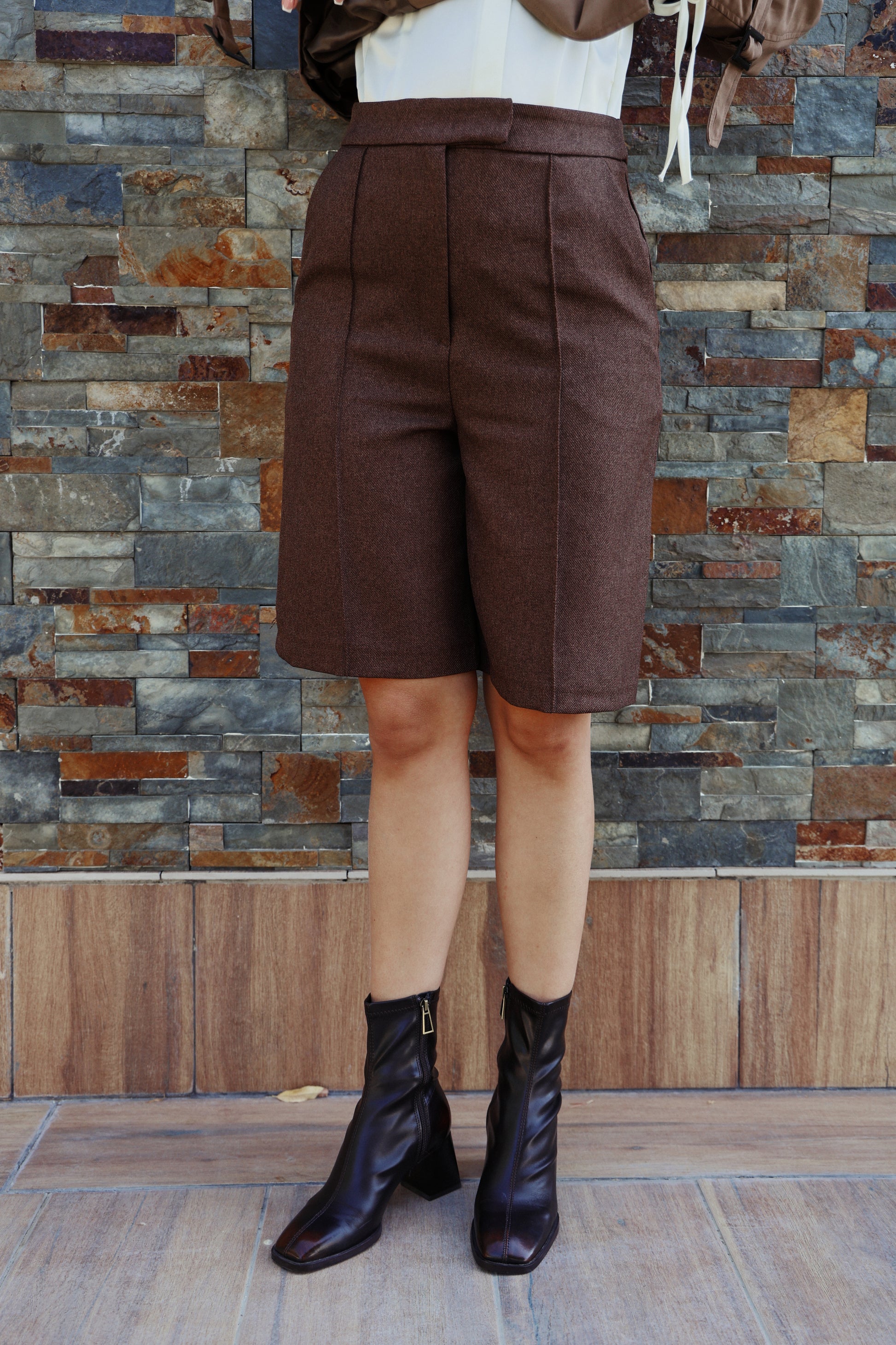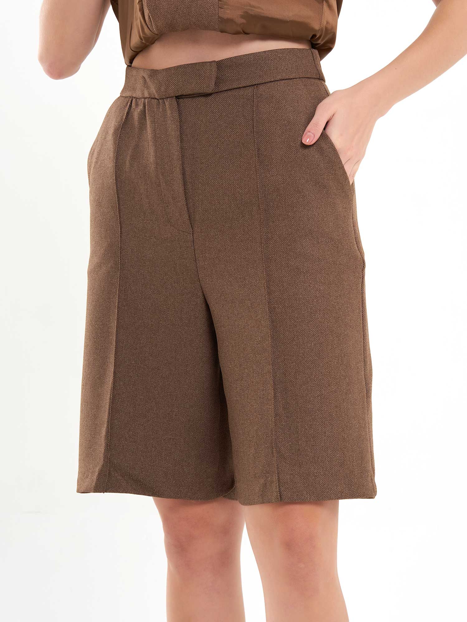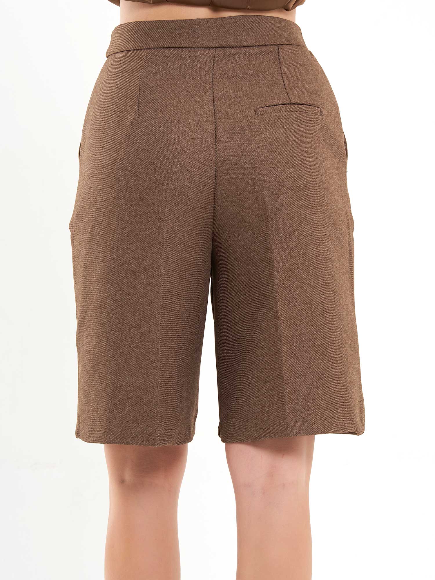 Your new tailored-but-playful staple. These structured Bermuda shorts come in a rich chocolate brown with a smooth, soft finish and a polished silhouette that works from daytime chic to evening elegance. Designed with sharp front seams for length and shape, a clean waistband, and a subtle back welt detail that keeps the look refined.