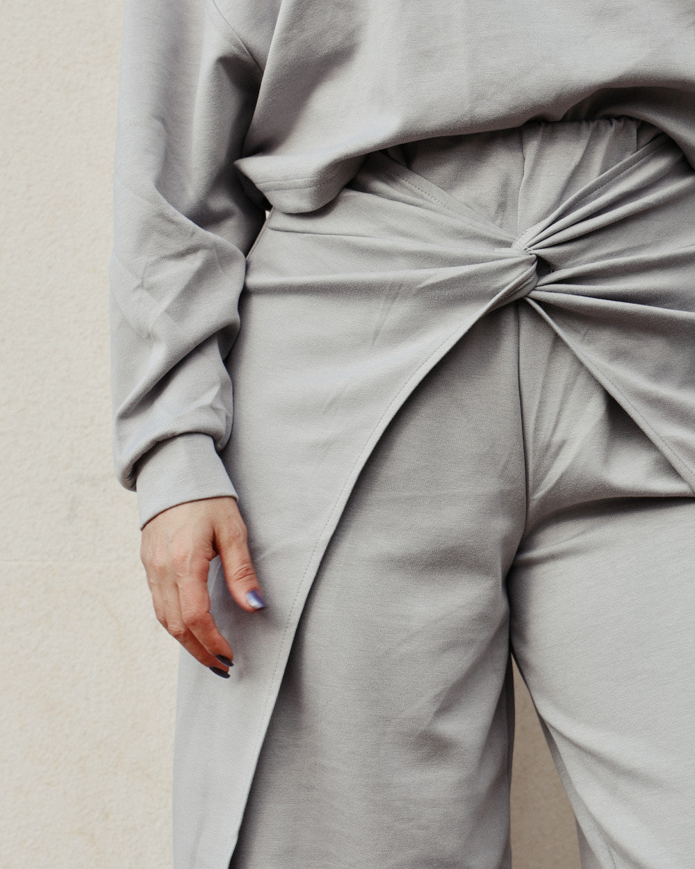 These joggers are where comfort meets sculpted elegance. Designed with a dramatic front twist and long flowing split panels, they create movement with every step while keeping the silhouette soft and flattering. The elasticated waistband ensures ease, while the draped overlay adds a luxe, elevated touch to your everyday loungewear. Perfect for day-to-night comfort with a statement twist.